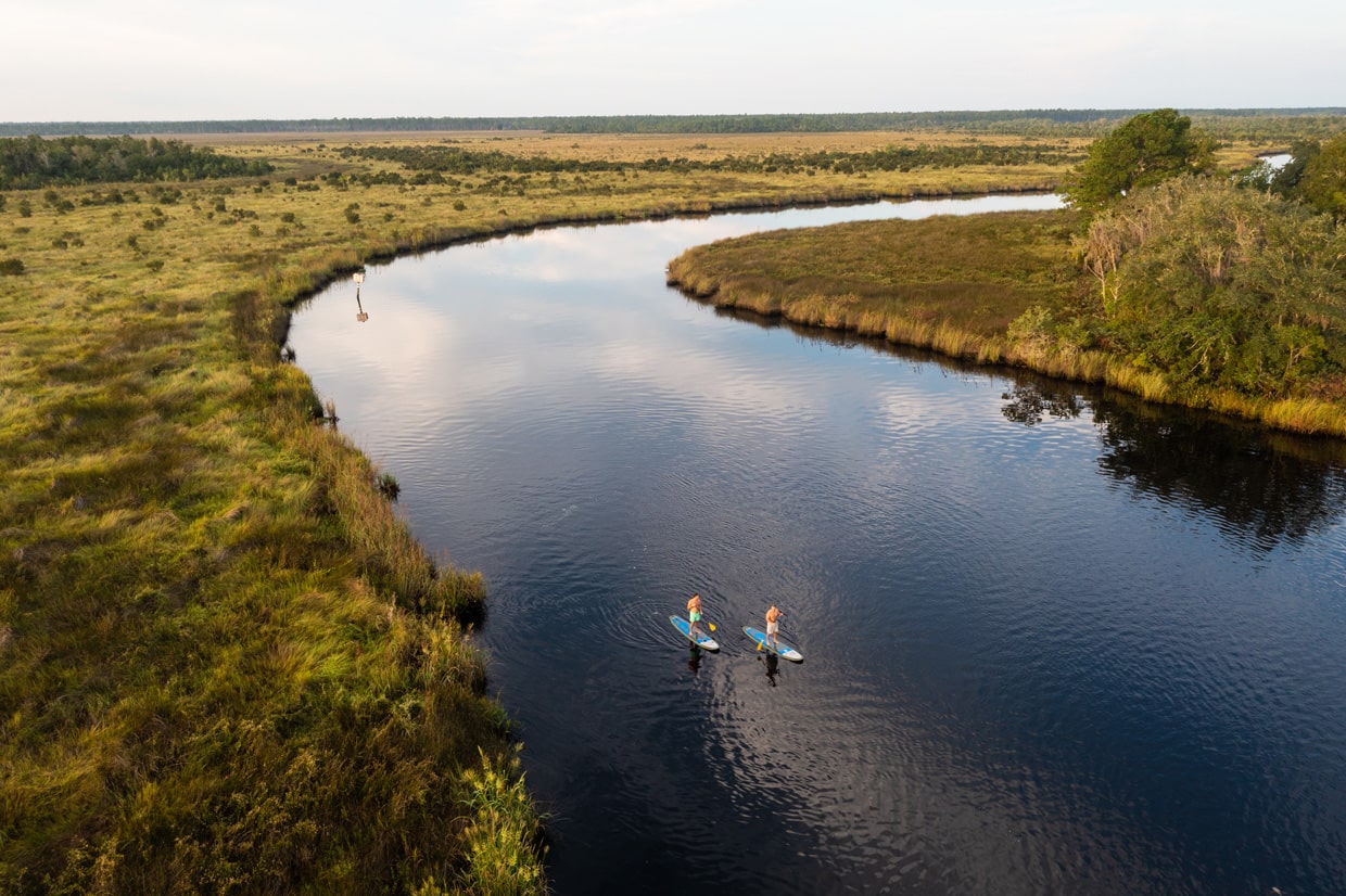 aerial of the nassau river with paddleboarders